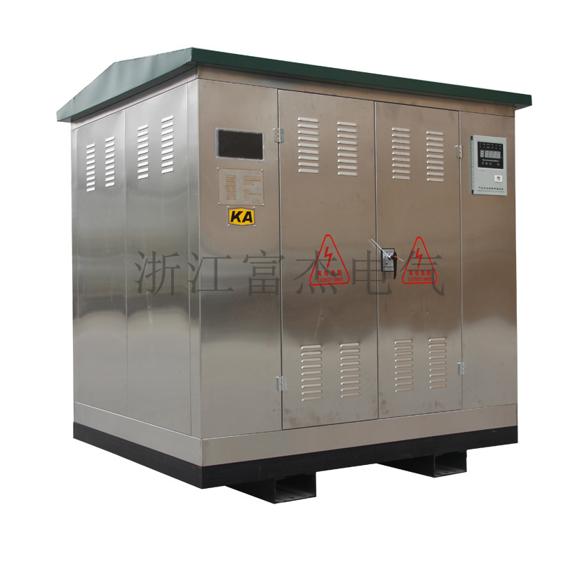 干式變壓器箱殼用鋼板焊接而成,主體側(cè)面加通風(fēng)孔,以增加散熱面。干式變壓器箱體下部有四個(gè)吊板,當(dāng)?shù)跗鹫麢C(jī)時(shí)必須同時(shí)使用。箱體下部設(shè)有滑靴。干式變壓器箱體下部設(shè)有二個(gè)M12外接地螺栓,并有接地符號(hào)。