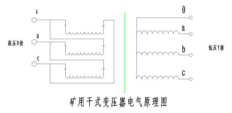 礦用一般型型干式變壓器作為非煤礦供電系統(tǒng)中的電氣設(shè)備,10kV(6kV)高壓電往前一級(jí)高壓配電裝置輸入到干式變壓器一次側(cè)帶電,二次感應(yīng)輸出低電壓,經(jīng)獨(dú)立使用的饋電裝置供給設(shè)備使用。